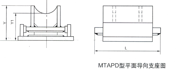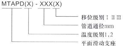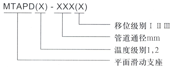 二、MTAPD型平面导向支座 1、适用条件: 通径:Dn100-1500mm 承载:10000-500000N 温度:1型≤400℃ 2型≤650℃ 2、型号说明: 3、选型说明: 若要选温度低于400℃的平面滑动支座,公称通径为400mm,要求位移为200mm,则型号为:MTAPD1-400 II 若要选温度高于400℃而低于650℃的平面滑动支座,公称通径为400mm,要求位移为300mm,则型号为:MTAPD2-400 III