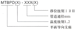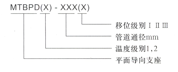 3、 选型说明: 若要选温度低于400℃的平面滑动支座,公称通径为1000mm,要求位移为200mm,,则型号为:MTBPD1-1000 II 若要选温度高于400℃而低于650℃的平面滑动支座,公称通径为1000mm,要求位移为300mm,则型号为:MTBPD2-1000 III